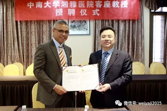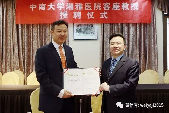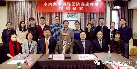 2017年12月6日上午,湘雅医院为美国德克萨斯大学MD安德森癌症中心核医学科Homer A. Macapinlac教授和卢洋教授举行了隆重的客座教授授聘仪式。中南大学湘雅医院副院长雷光华教授为两位教授颁发聘书并佩戴院徽。