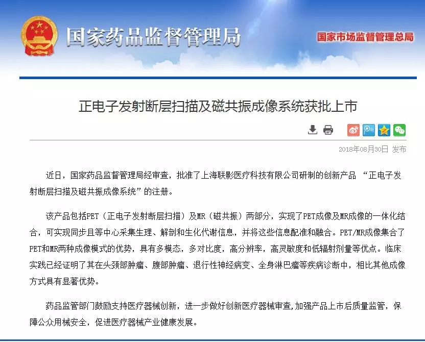日前,国家药品监督管理局官网发布公告,国家药品监督管理局经审查,批准了上海联影医疗科技有限公司研制的创新产品 “正电子发射断层扫描及磁共振成像系统”的注册。世界首台中国制造的PET/MR获批上市,热烈祝贺!