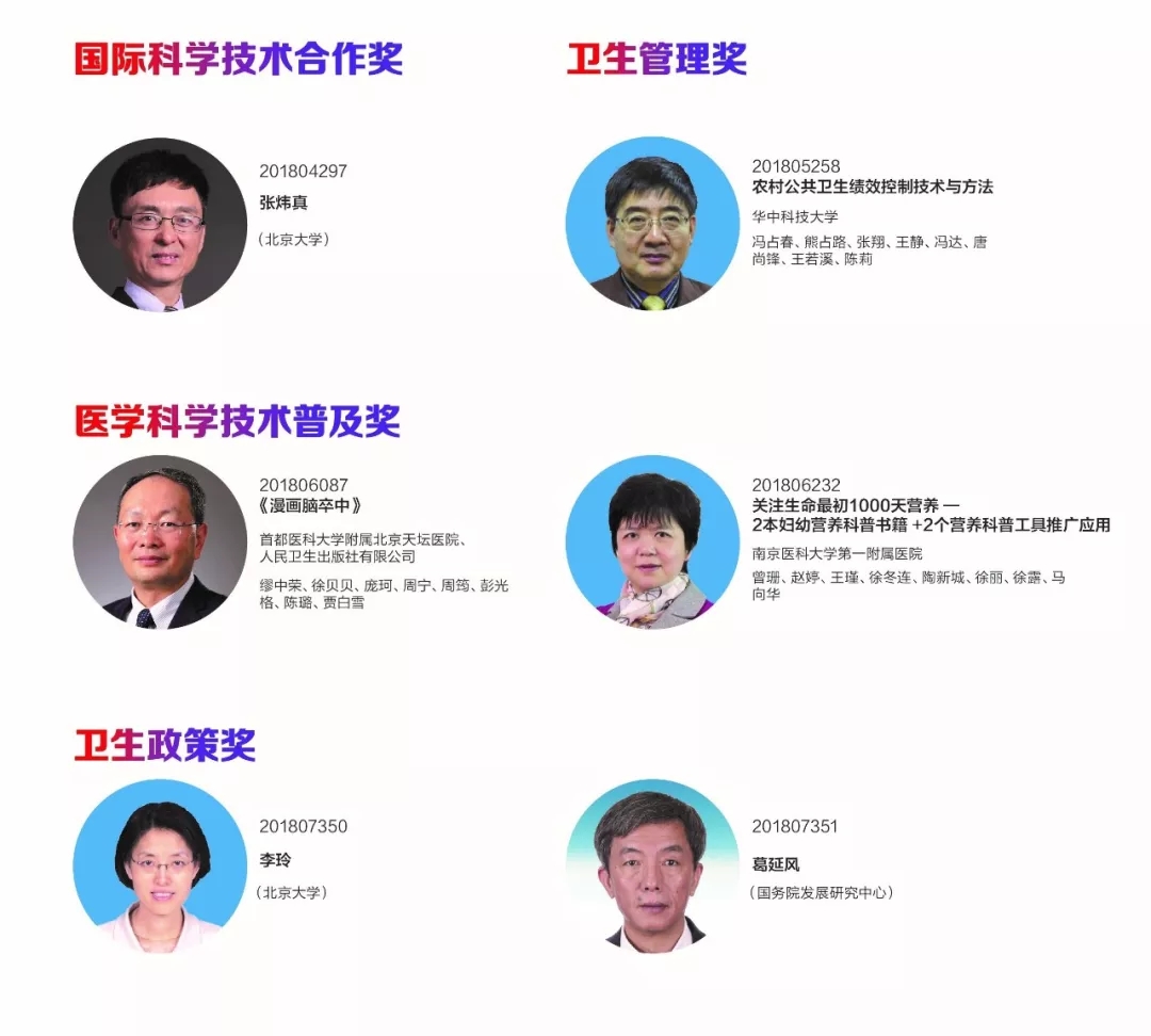 国际科学技术合作奖、卫生管理奖、医学科学技术普及奖、卫生政策奖、青年科技奖获得者