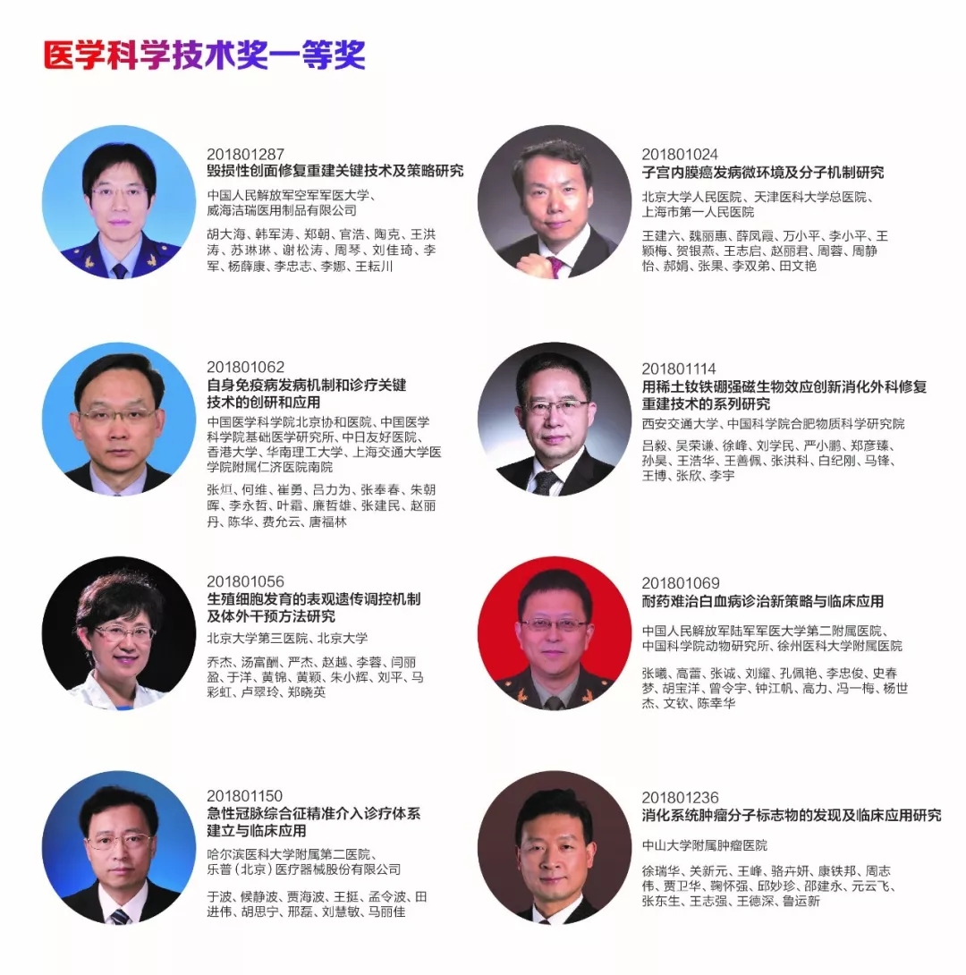 纵观2018年中华医学科技奖医学科学技术奖一等奖项目,呈现以下几大特点。一是聚焦关键技术的重大突破,自主创新能力显著增强;二是多单位、多中心协同攻关,临床科研及诊疗水平明显提升;三是机制研究以临床需求为导向,基础科学与应用科学有机结合;四是医工结合,跨学科领域研究结出硕果;五是基础医学研究深入开展,国际影响力与日俱增;六是以人民健康为中心,注重常见疾病、重大疾病的早诊早治及防控,切实降低患者及国家医疗负担,让人民生活更美好。