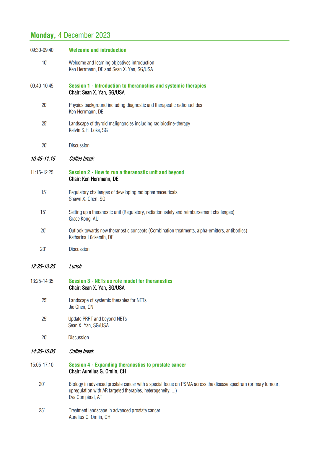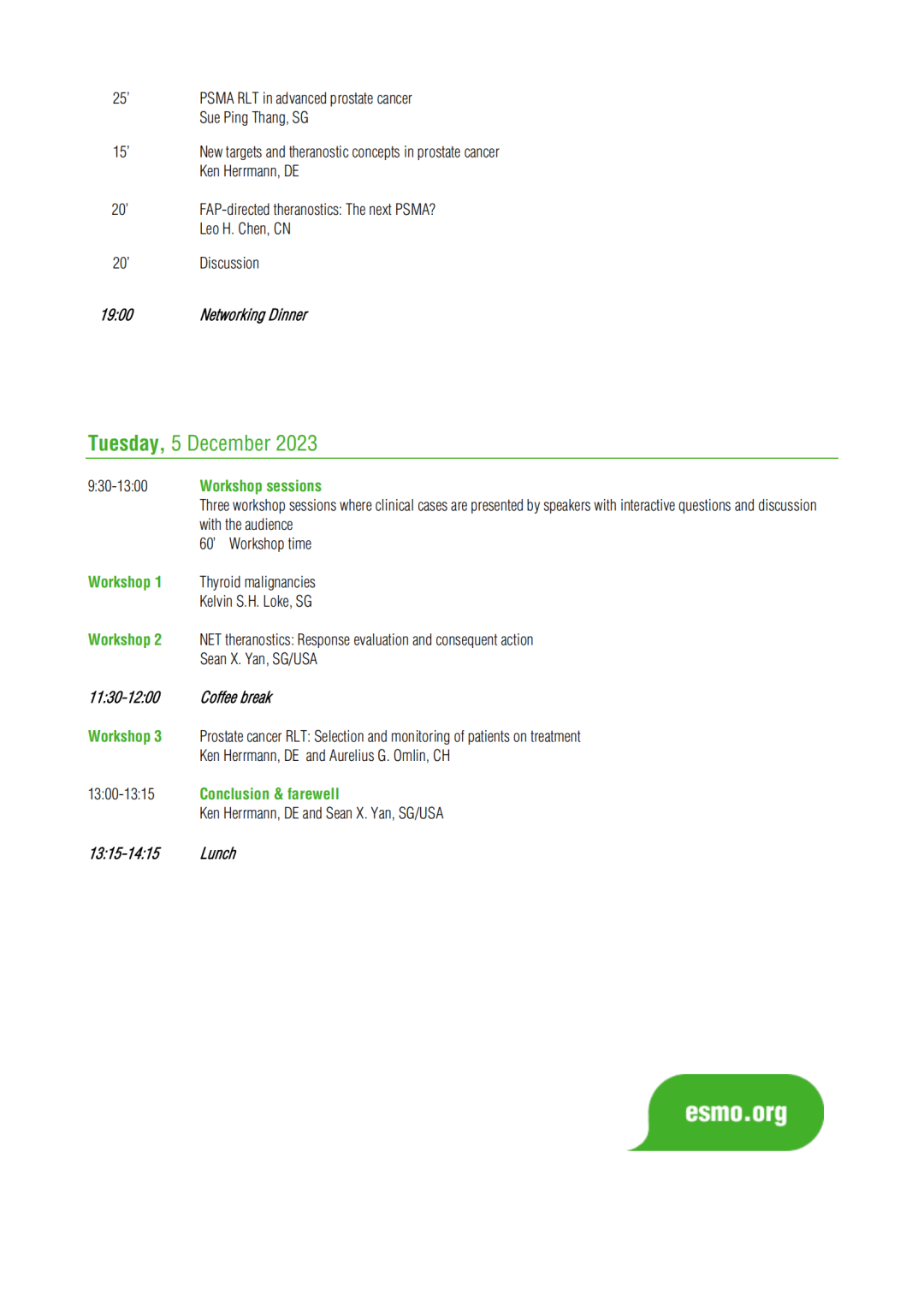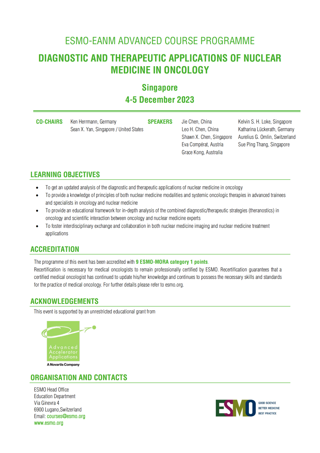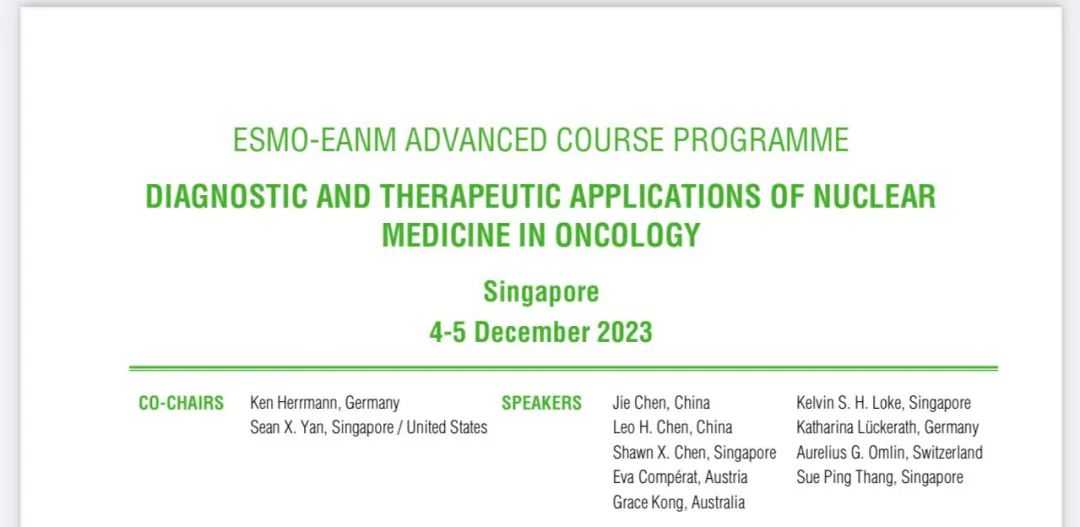 2023年12月4-5日,欧洲肿瘤学会(ESMO)和欧洲核医学会(EANM)核医学诊断与治疗在肿瘤学中的应用高级课程在新加坡举行。来自澳地利,德国,瑞士,澳大利亚,新加坡和中国的10位教授莅临会场传道授业,14个亚太国家与临床肿瘤相关的7个专业的53位医生参加了课程。