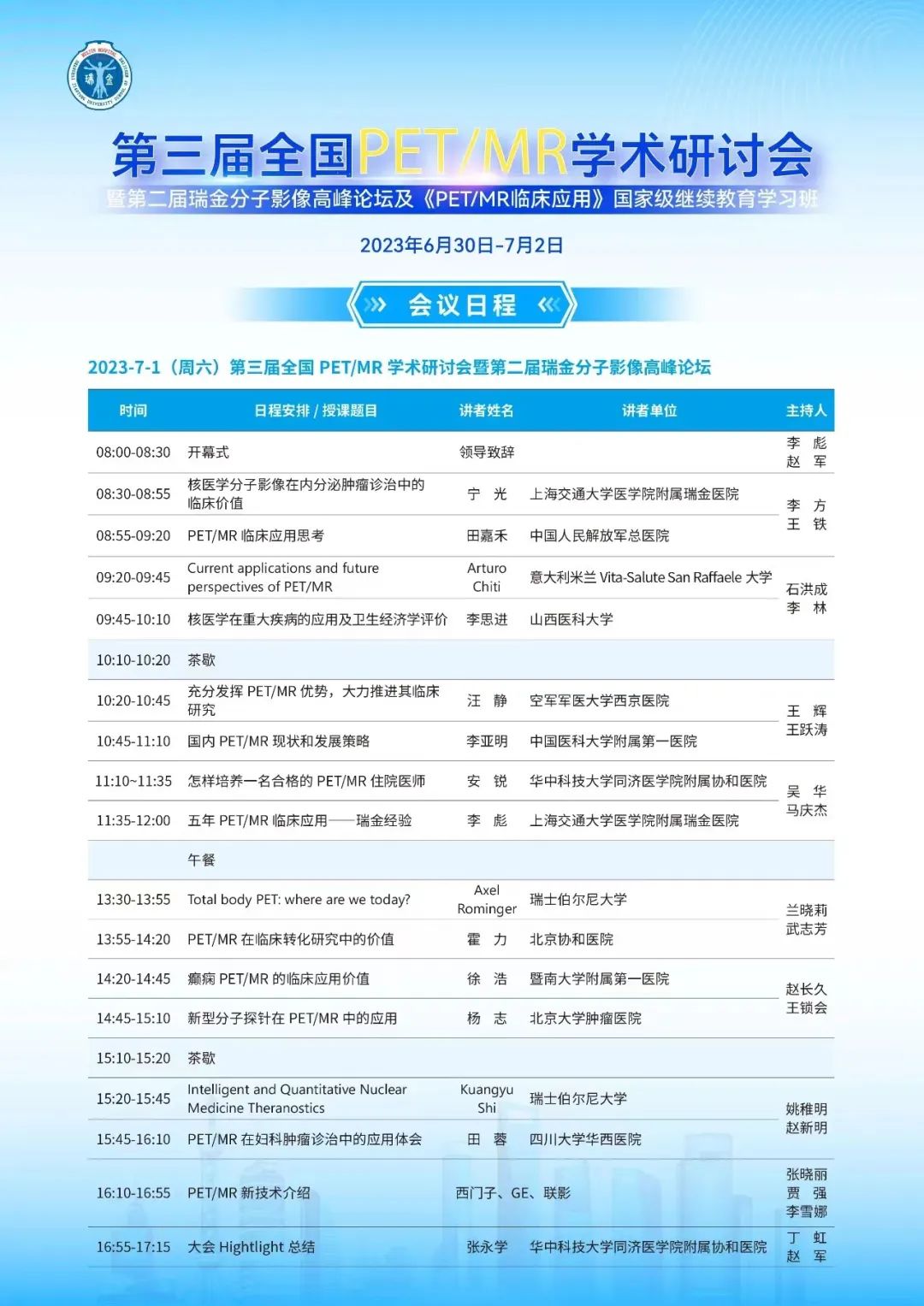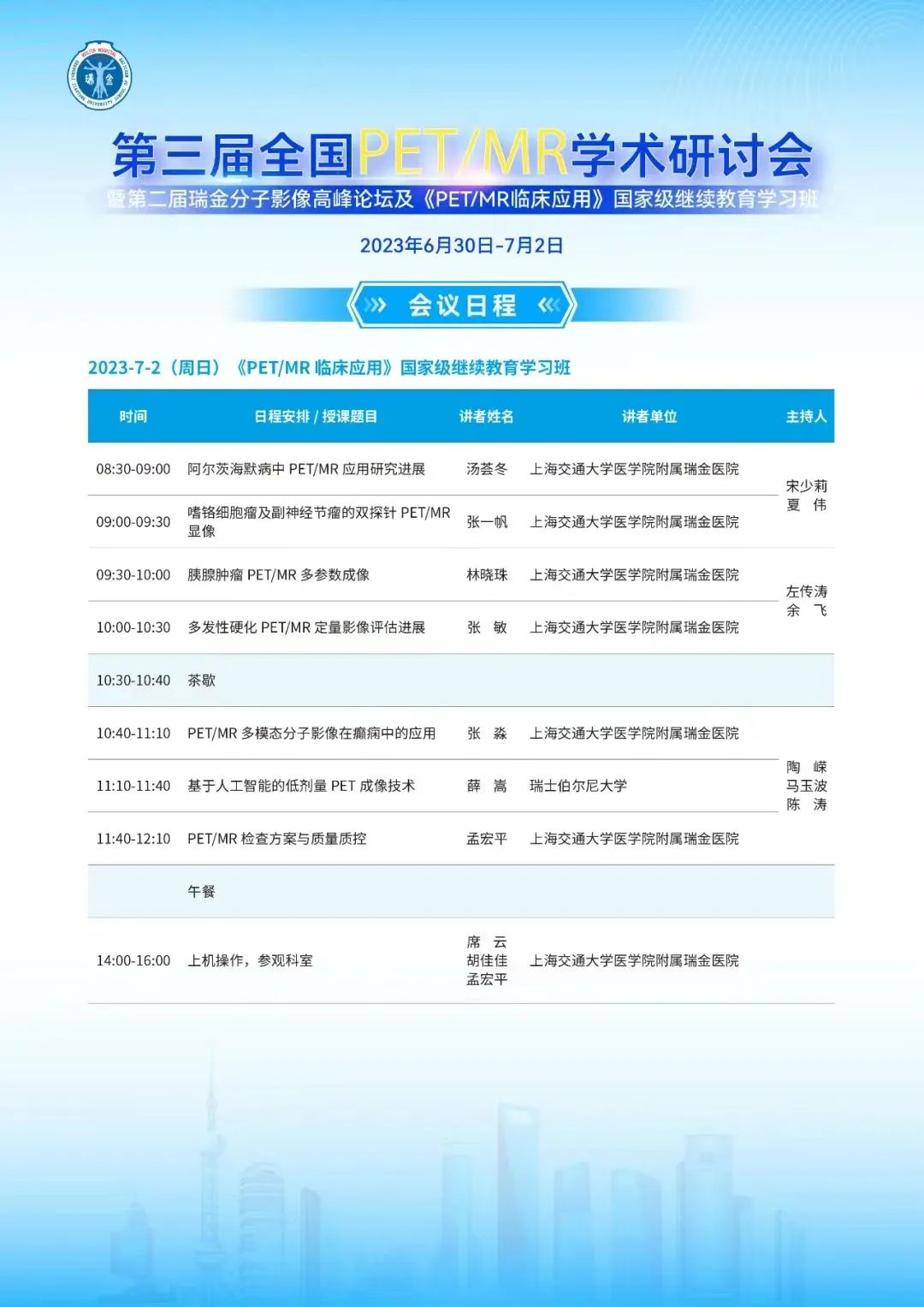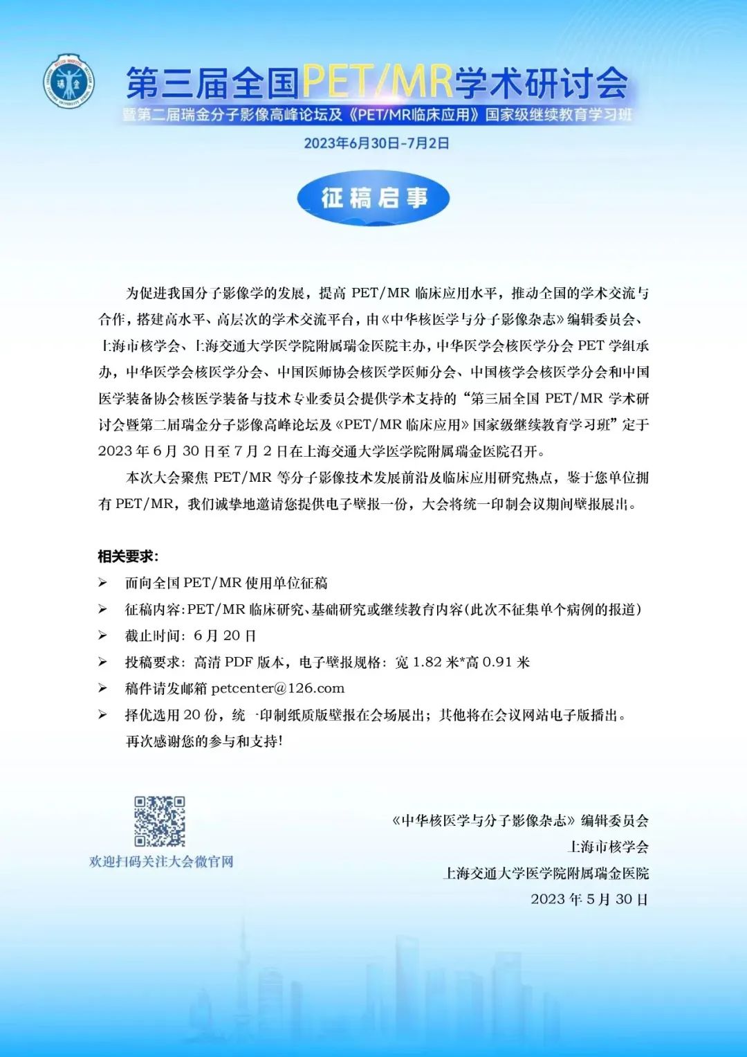 为促进我国分子影像学的发展,提高PET/MR临床应用水平,推动全国的学术交流与合作,搭建高水平、高层次的学术交流平台,由《中华核医学与分子影像杂志》编辑委员会、上海市核学会、上海交通大学医学院附属瑞金医院主办,中华医学会核医学分会PET学组承办,中华医学会核医学分会、中国医师协会核医学医师分会、中国核学会核医学分会和中国医学装备协会核医学装备与技术专业委员会提供学术支持的“第三届全国PET/MR学术研讨会暨第二届瑞金分子影像高峰论坛及《PET/MR临床应用》国家级继续教育学习班”定于2023年6月30日至7月2日在上海交通大学医学院附属瑞金医院召开。本次大会聚焦PET/MR等分子影像技术发展前沿及临床应用研究热点,鉴于您单位拥有PET/MR,我们诚挚地邀请您提供电子壁报一份,大会将统一印制会议期间壁报展出。相关要求: