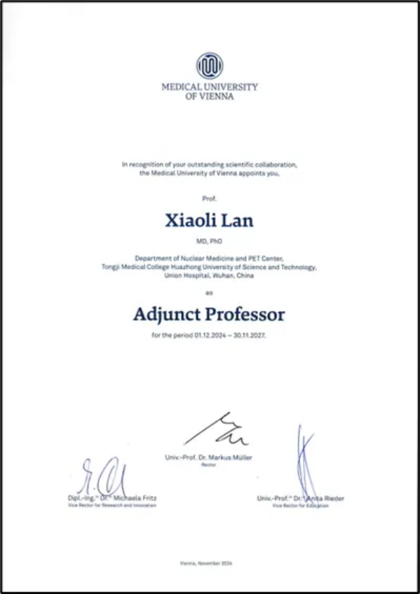 维也纳医科大学在声明中表示,客座教授职位仅授予与该校保持长期合作且在学术领域具备卓越贡献的专家。兰晓莉教授多年来带领团队深耕核医学学科建设,注重技术创新与跨学科融合,积极推动国际科研交流与合作,为核医学临床应用的发展做出重要贡献。维也纳医科大学高度评价兰晓莉教授的学术成就,并期待通过深化合作,共同推动核医学领域的创新与进步。