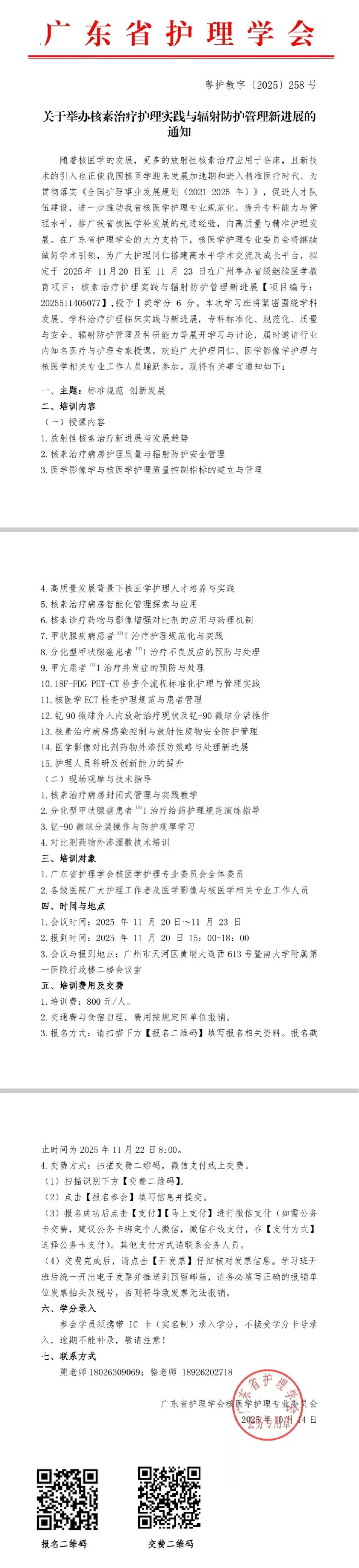 随着核医学的发展,更多的放射性核素治疗应用于临床,且新技术的引入也正使我国核医学迎来发展加速期和进入精准医疗时代。为贯彻落实《全国护理事业发展规划(2021-2025年)》,促进人才队伍建设,进一步推动我省核医学护理专业规范化,提升专科能力与管理水平,推广广东省核医学科发展的先进经验,向高质量与精准护理发展。在广东省护理学会的大力支持下,核医学护理专业委员会将继续做好学术引领,为广大护理同仁搭建高水平学术交流及成长平台,拟定于2025年11月20日至11月23日在广州举办省级继续医学教育项目:核素治疗护理实践与辐射防护管理新进展培训班。欢迎广大护理同仁、医学影像学护理与核医学相关专业工作人员踊跃参加。