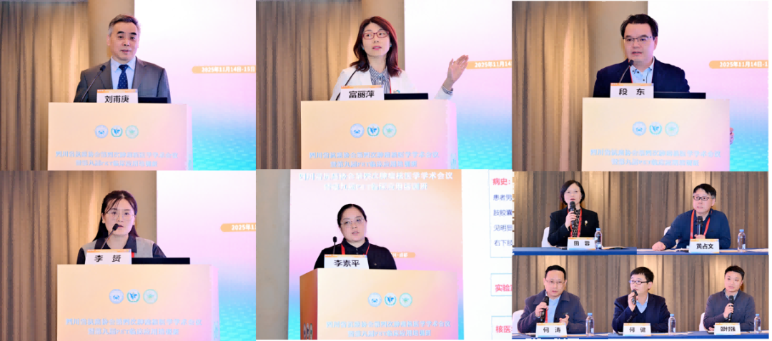 14日下午的学术交流环节在四川省肿瘤医院程祝忠教授的主持下拉开序幕。首先,北京医院刘甫庚教授做了“核医学诊疗一体化之机遇与挑战”的大会报告,刘教授详细阐述核医学诊疗技术发展的机遇与挑战。随后,中日友好医院富丽萍教授分享“分子影像技术在AD临床诊疗与研究中的应用价值”,拓展学科跨界应用视野。重庆大学附属重庆市人民医院段东教授解读“2025版ATA甲状腺癌诊治指南要点”,为临床规范更新提供依据。后续报告中,北京核工业医院李赟教授详解“131I-mIBG治疗转移性嗜铬细胞瘤/副神经节瘤”的临床经验;川北医学院附属医院李素平教授分享“225Ac-PSMA治疗转移性去势抵抗性前列腺癌的初步临床应用”成果,为新型核素治疗提供实践参考。下午的学术交流活动分别由四川大学华西医院田蓉教授、西南医科大学黄占文教授、攀枝花中心医院何涛教授、成都中医药大学附属医院何健教授、自贡市第一人民医院邵付强教授主持。