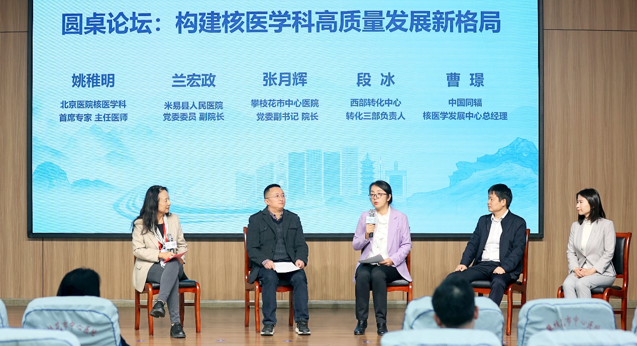 北京医院姚稚明教授主持了“构建核医学科高质量发展新格局”的圆桌论坛,此次论坛分别邀请了医院领导代表攀枝花市中心医院院长张月辉和米易县人民医院副院长兰宏政、政府代表先进技术成果西部转化中心转化三部负责人段冰、产业代表中国同辐核医学发展中心负责人曹璟。各位嘉宾分别从政策转化、应用端创新和产业端支撑等角度全方位讨论了核医学科高质量发展生态圈的协同共赢,为核医学政产学研医实践指明了方向。
