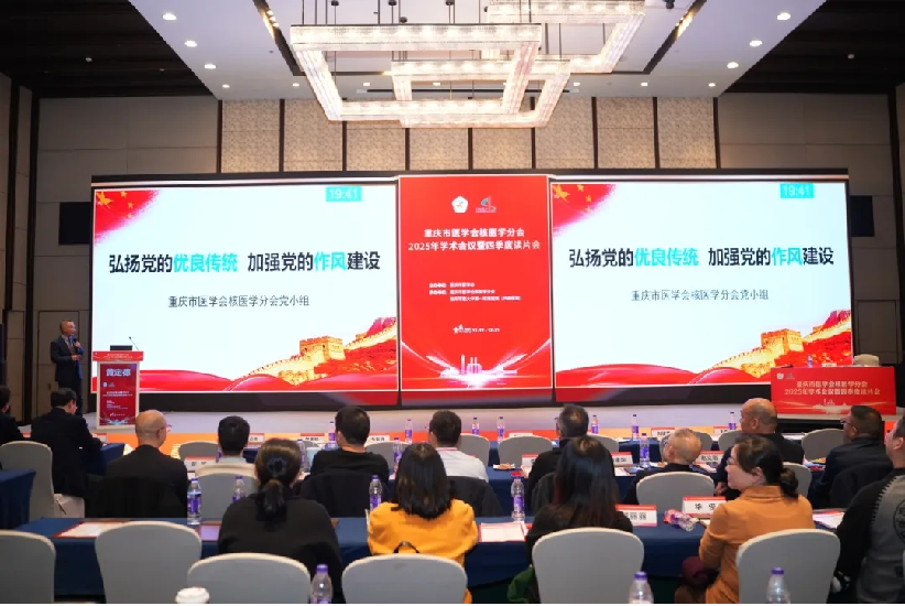 会议期间,分会党小组召开了专题党课及第五次全体委员工作会议。分会主任委员、党小组组长黄定德教授围绕“弘扬党的优良传统,加强党的作风建设”进行授课,强调要将党的优良作风落到实处,始终贯穿于每位委员的日常工作、生活与学习中。同时他对2023年至2025年重庆市核医学学科发展及业务开展情况进行了比较、分析,并全面总结了2025年度分会各项工作,对2026年重点任务做了详细部署与安排,表示学会将继续关注基层核医学学科发展与技术推广,进一步加强与政府及职能部门的沟通,引领重庆市核医学不断取得新的突破、稳步向前发展。