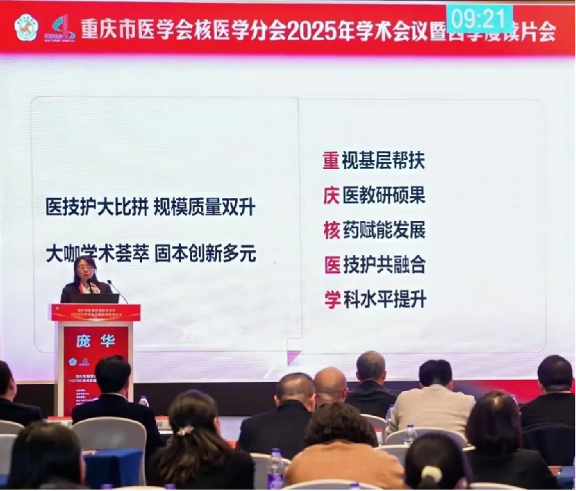 会上,围绕“核医学学科建设、质量控制、放射防护法规、AI影像、放药研发与转化、多模态融合显像、新型分子探针及核素治疗、甲功及甲状腺癌标志物检测等议题,汪静教授、复旦大学附属中山医院石洪成教授、刘亮晴处长、海军军医大学附属长海医院左长京教授、华中科技大学附属协和医院兰晓莉教授、北部战区总医院张国旭教授、解放军总医院第一医学中心王瑞民教授、上海交大附属仁济医院刘建军教授、中国工程物理研究院二所杨宇川教授、西南医科大学附属医院陈跃教授、陆军特色医学中心陈晓教授、四川大学华西医院田蓉教授、广西医科大学第一附属医院韦智晓教授、重庆市人民医院段东教授、重庆大学附属中心医院李倩教授、重庆大学附属三峡医院刘徽婷教授分别进行了精彩纷呈的专题报告,全面展现了核医学领域的最新进展和技术应用。