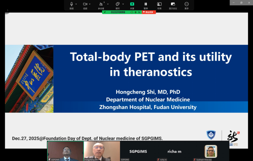 2025年12月27日在印度桑贾伊·甘地医学科学研究生院(Sanjay Gandhi Post Graduate Institute of medical sciences,SGPGIMS)的哈戈维德 库拉纳(Har Govind Khurana)礼堂举办了题为“核医学复兴:分子影像与放射性核素治疗前沿技术“的学术研讨会,以庆祝该院核医学科建科36周年。应印度医学会核医学分会前任主委Prasanta Kumar Pradhan 教授的邀请,石洪成教授在线上做了题为“Total-body PET and its utility in theranostics”的学术报告,分享了全身PET的临床应用经验,以及在诊疗一体化方面的探索性应用。在会议主持人介绍后,作为本次学术研讨会的主席,Prasanta Kumar Pradhan 教授补充介绍到,石洪成教授作为全球全身PET临床应用的引领者,不仅发表了数十篇高质量的探索性学术论文,而且还牵头制定了国际专家共识,出版了专著和多篇高质量综述,为这项先进技术的应用与推广做出了卓越贡献。