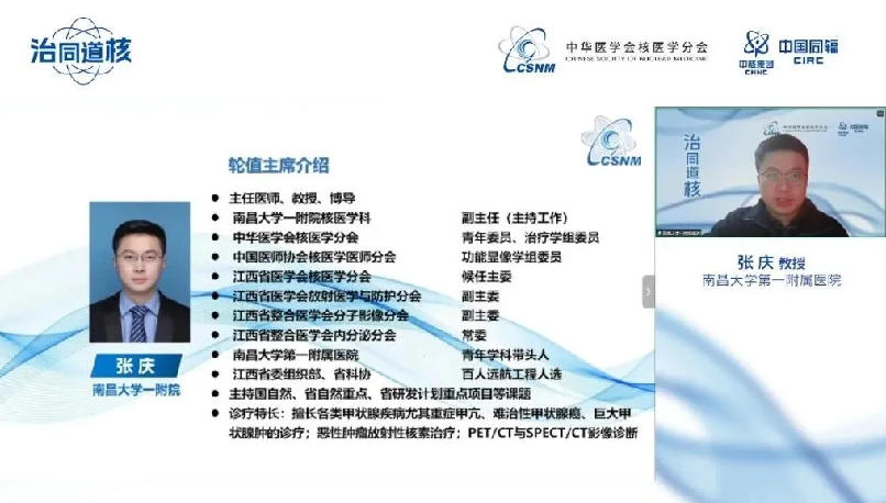 汇报结束后,本次会议轮值主席、南昌大学第一附属医院核医学科张庆教授对该研究给予高度评价。张庆教授指出,这项研究填补了全球碘难治性甲状腺癌α粒子靶向治疗领域的空白。作为I期剂量探索性临床试验,研究的重点在于安全性验证与初步疗效信号捕捉,为后续剂量爬坡、疗程优化以及多周期应用提供了坚实的科学依据。211At具有独特的核物理特性——半衰期短(7.2小时)、能量高、路径稳定,其α粒子能在仅数十微米范围内释放全部能量,从而精准杀伤肿瘤细胞、避免周围正常组织损伤,充分体现出α治疗的“定点爆破”优势。同时,211At标记小分子稳定性高、脱靶风险低,可跨越血脑屏障,在未来有望拓展至脑转移或神经系统肿瘤的精准放射治疗领域。张庆教授还强调,目前国内已有产业机构启动211At制备与应用平台的建设,这一布局不仅意味着我国在核素自主生产方面的技术能力正在增强,也预示着211At有望实现从科研到临床、从实验室到产业化的跨越。值得关注的是,211At短半衰期特性使其可实现门诊治疗与短期影像学追踪,大大提升了患者依从性与医疗系统效率,但同时放射性核素管理政策仍需进一步完善,以在安全监管与临床创新之间找到科学平衡点。
