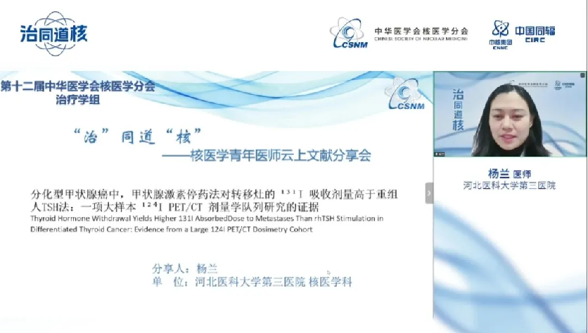 汇报结束后,本次“治” 同道 “核” 云上分享会的轮值主席、河北医科大学第三医院解朋教授充分肯定了杨兰医生对这篇文章的精准解读与全面梳理,指出该文献为TSH刺激方案选择提供了关键证据,明确THW在转移灶治疗中的剂量优势,为高转移风险患者方案优化提供重要参考,而两种方案对残余灶效果一致的结论,也为临床个体化决策提供了科学依据,对临床工作具有重要指导价值。