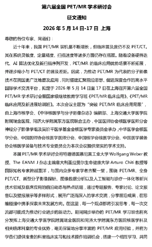 为推动PET/MR为代表的分子影像技术在我国更广泛地普及应用,同时搭建汇聚前沿思想、促进深度合作的高水平国际学术交流平台,拟定于2026年5月14日至17日在上海召开第六届全国PET/MR学术研讨会暨国家级继续教育学习班《PET/MR临床应用》、《PET/MR临床应用及新进展培训班》。本次会议主题为“突破PET/MR临床应用局限”,由上海市核学会、《中华核医学与分子影像杂志》编辑部、上海交通大学医学院附属瑞金医院、同济大学附属东方医院联合主办,中国医师协会核医学医师分会神经分子影像学组及吴阶平医学基金会核医学专家委员会承办,中华医学会核医学分会、中国医师协会核医学医师分会、中国核学会核医学分会、中国医学装备协会核医学装备与技术专业委员会为本次会议提供坚实的学术支持。现将会议的征文内容及有关事项通知如下: