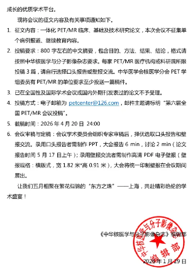 3.投稿方式:电子邮箱为petcenter@126.com,邮件主题请标明“第六届全国PET/MR会议投稿”。