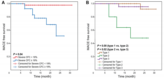 根据严重CFC(A)和 CMVD类型(B)的Kaplan-Meier生存曲线