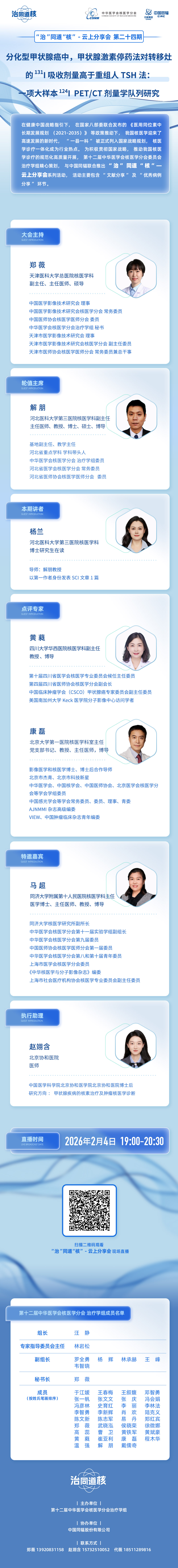 治”同道“核”- 云上文献分享会(第24期,总第34期)将于2026年2月4日(星期三)19:00-20:30在线上举行。来自河北医科大学第三医院核医学科杨兰医师将带来题为《分化型甲状腺癌中,甲状腺激素停药法对转移灶的 ¹³¹I 吸收剂量高于重组人TSH法:一项大样本 ¹²⁴I PET/CT 剂量学队列研究的证据》的相关文献分享。扫描下方二维码进入会议直播间,期待您的参与!