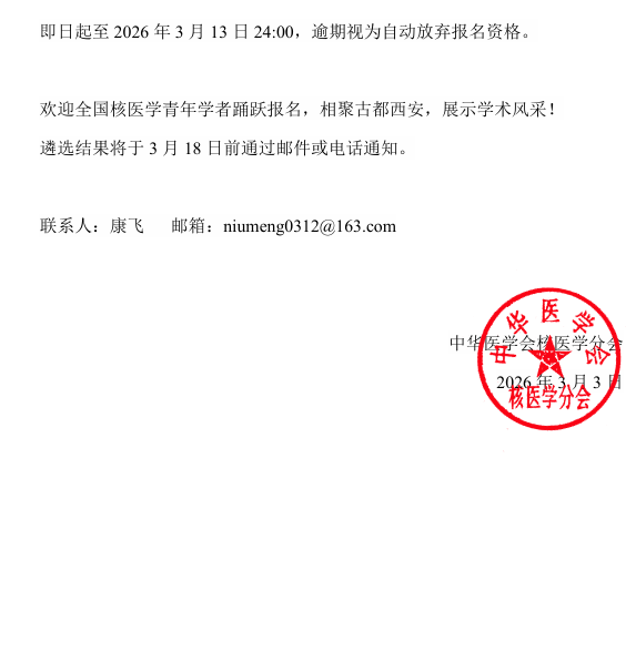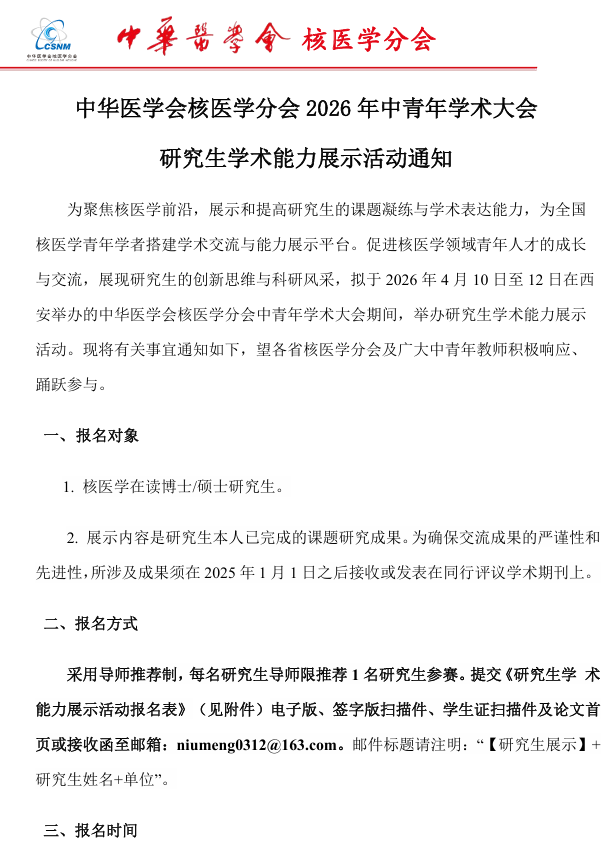 为聚焦核医学前沿,展示和提高研究生的课题凝练与学术表达能力,为全国 核医学青年学者搭建学术交流与能力展示平台。促进核医学领域青年人才的成长 与交流,展现研究生的创新思维与科研风采,拟于2026年4月10日至12日在西 安举办的中华医学会核医学分会中青年学术大会期间,举办研究生学术能力展示 活动。现将有关事宜通知如下,望各省核医学分会及广大中青年教师积极响应、 踊跃参与。